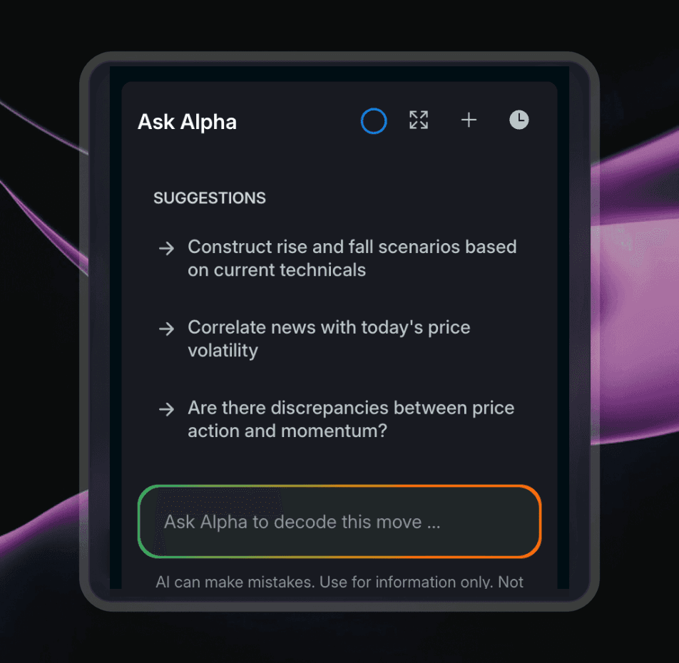 Converse with "Ask Alpha" to explore your ideas and reasoning behind price forecasts. Leverage its abilities to draw on charts and perform complimentary research for deeper market insights. Gain an edge in exploring high-conviction opportunities.